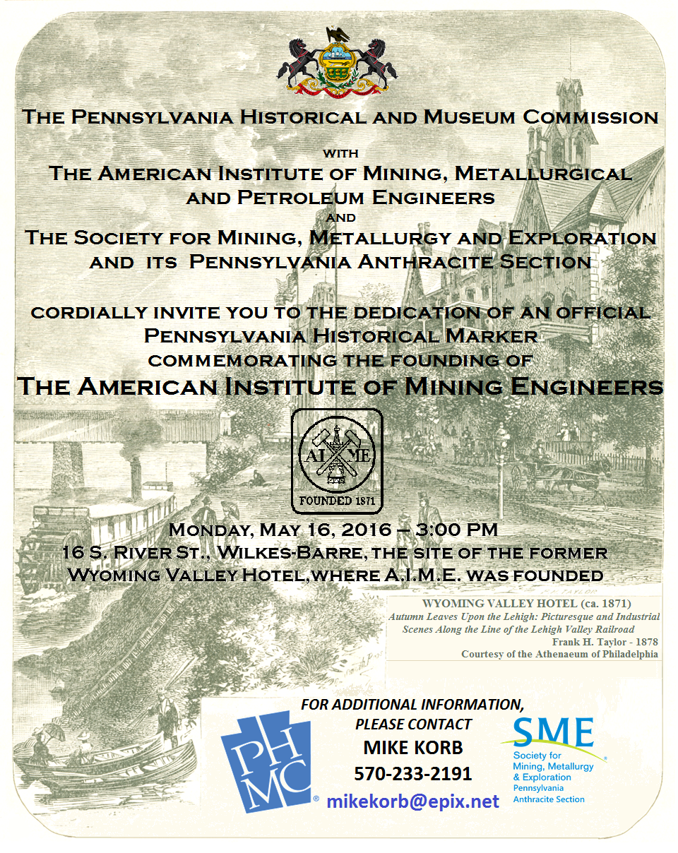 The Pennsylvania Historical and Museum Commission with the American Institute of Mining, Metallurgical and Petroleum Engineers and the Society for Mining, Metallurgy and Exploration and its Pennsylvania Anthracite Section cordially invite you to the dedication of an official Pennsylvania Historical Marker commemorating the founding of The American Institute of Mining Engineers.